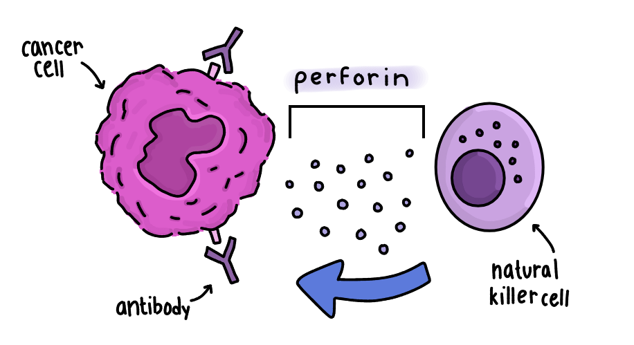 In a process called antibody-dependent cell-mediated cytotoxicity (ADCC), antibodies attach to cancer cells, signaling immune cells like natural killer cells to destroy them. These immune cells release proteins like perforin, which cause the cell wall to lyse and the cell to die.